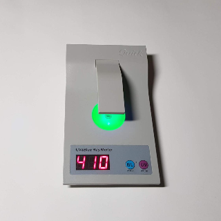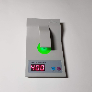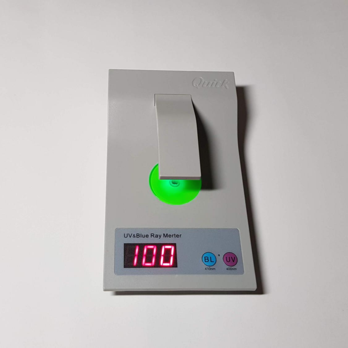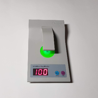 오른쪽 붉은 UV 버튼을 누르면 숫자표시부에 400이 표시된 후 100으로 세팅됩니다. 측정대에 렌즈를 올려두시면 측정이 가능합니다.